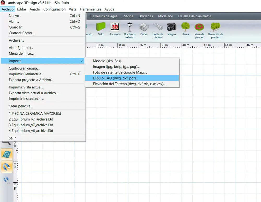 Graças à compatibilidade do Landscape3Design com CAD, poderá importar as superfícies obtidas com o Moasure ONE, de forma fácil e rápida, em formato DXF. Dessa forma, disporá da planimetria para iniciar o projeto.